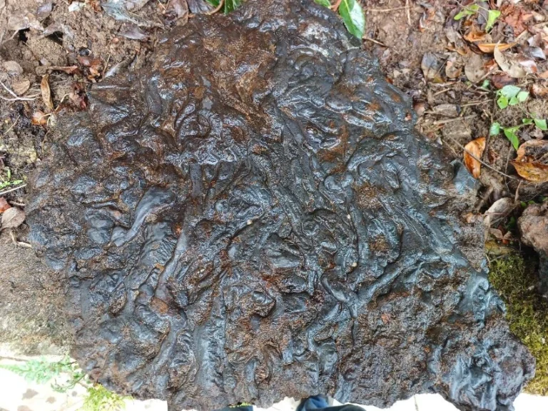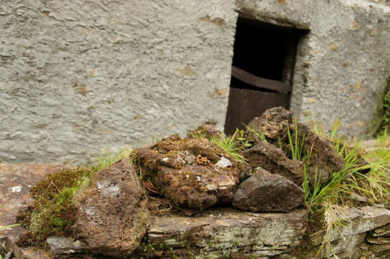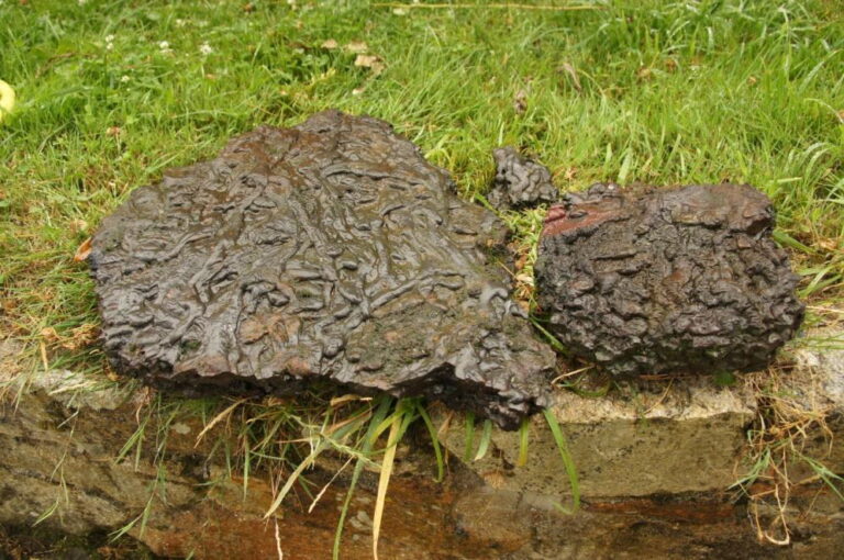 As escouras de sangrado producidas durante a calcinación do mineral teñen un aspecto característico. A fotografía fíxose de restos que quedaron no Chao do Batán, Tralasbouzas, mesmo debaixo de Escourido, na parroquia de Ourol, despois da retirada feita na década dos anos 60 do século pasado.