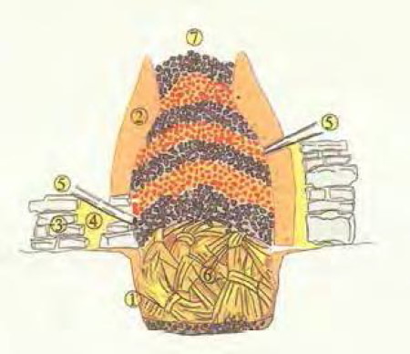 Recreación de horno romano. 1: fosa; 2: paredes de arcilla refractaria; 3: murete perimetral; 4: relleno de arena; 5: toberas; 6: pajas y ramas para el encendido; 7: capas alternativas de carbón vegetal y mineral; 8: orificio de sangrado (en Fernández-Posse et al. 2002: 125).