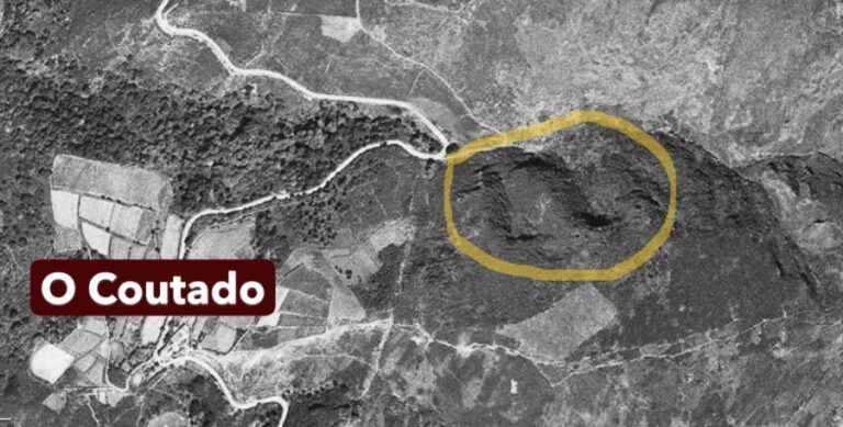 É unha mina a ceo aberto preto do alto do monte, da que había coñecemento na tradición oral dos habitantes do lugar, non só da súa existencia, xa que ten unhas dimensións considerables, senón das localizacións onde se transformaba o material en ferro. Na visita que fixemos a Tomás e a familia, a última que habita o lugar de O Coutado, a súa muller afirmou que escoitara o seu sogro dicir que había un túnel que chegaba a Sabucedo, xa na parroquia de Ourol, polo que sacaban o material.