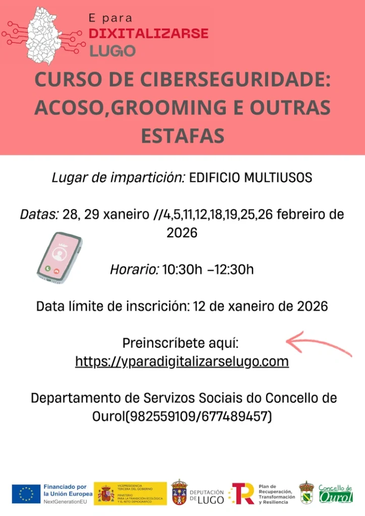 Ya está abierta la preinscripción para la acción formativa “CIBERSEGURIDAD: ACOSO, GROOMING Y OTRAS ESTAFAS” dentro del programa “PARA DIXITALIZARSE LUGO”