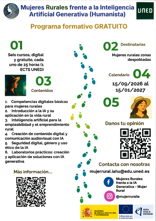 - OBXECTIVO XERAL: Capacitar ás mulleres do ámbito rural no uso ético, práctico e estratéxico da Intelixencia Artificial Xenerativa (IA-G), fortalecendo as súas competencias dixitais para a mellora de empregabilidade, o emprendemento e a participación activa na transformación dixital das súas comunidades.